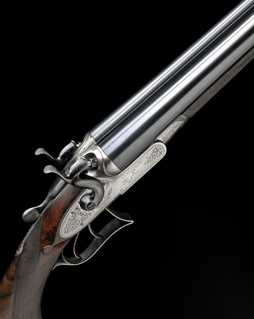 30in. sleeved nitro barrels, 2 1/2in. chambers, bored approx. imp. cyl. and 3/4 choke, action incorporating J. Thomas rectangular wedge bolt patent locking system, patent no. 3091 of 1871, carved percussion fences, patent off-centre toplever, rebounding locks, angular triggerguard, border and fine scroll engraving, renewed finish, Hollis patent fore-end release catch, 14 3/8in. figured pistolgrip stock with skeletal steel buttplate (cracked at hand), weight 6lb. 15oz.