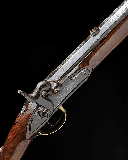 circa 1780, converted from flintlock circa 1840, with slightly swamped 20 1/2in. barrel, brass dove-tailed fore-sight, rearsight with folding leaf, numbered '22' at breech, plain bevel-edged lock and hammer, walnut full-stock with sliding patch-box in right hand side of butt, raised cheek-piece to left hand side, brass furniture (heel-plate numbered '22'), iron swivels and brass-mounted iron ram-rod marked 'G.T.F. 22' at tip (cleaned with light corrosion to iron surfaces, stock cracked forwards of lock-plate, loss of wood behind top-tang)