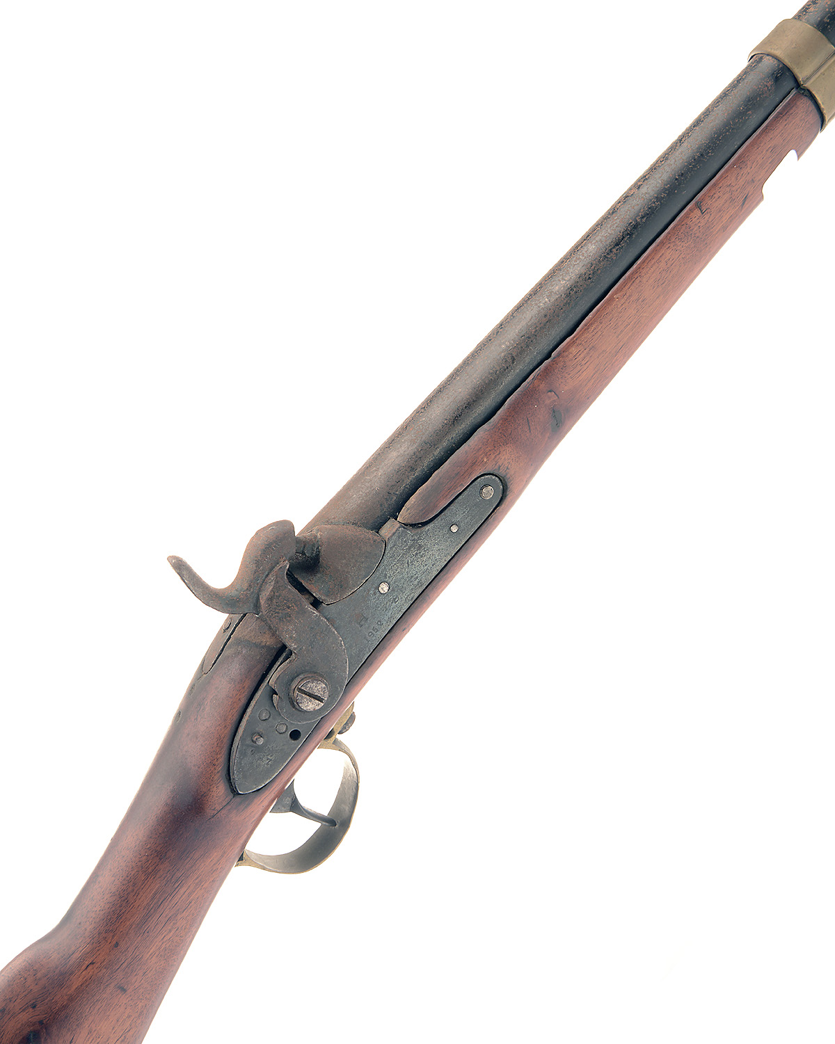 * A .740 PERCUSSION MUSKET, UNSIGNED, no visible serial number, Belgian or French and dated for 1856, with slightly shortened 40in. barrel, military style lock of flintlock form, walnut full-stock and brass furniture