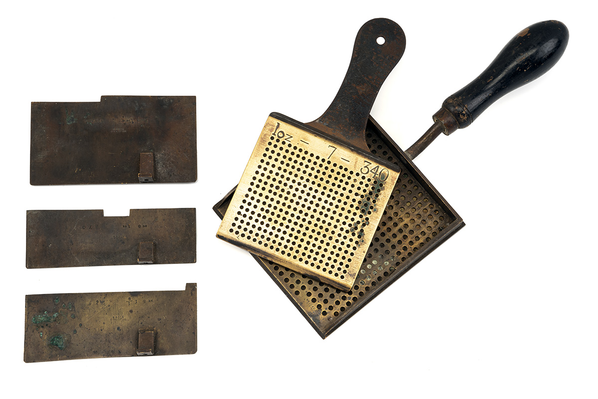 both mid to late 19th century, the first of brass perforated tray form and with an adapter plate marked 'No.6', '1oz' & '270' together with the signature 'WM JONES BIRM.M', fitted with a wooden file-type handle to rear and complete with two further signed brass adapter plates, one marked 'No.3' '1 1/4oz' & '175', the other 'No.5', '1 1/8' & '246', the second comprising of a a perforated brass plate marked along the top '1oz - 7 - 340' and mounted on an iron spatulate handle