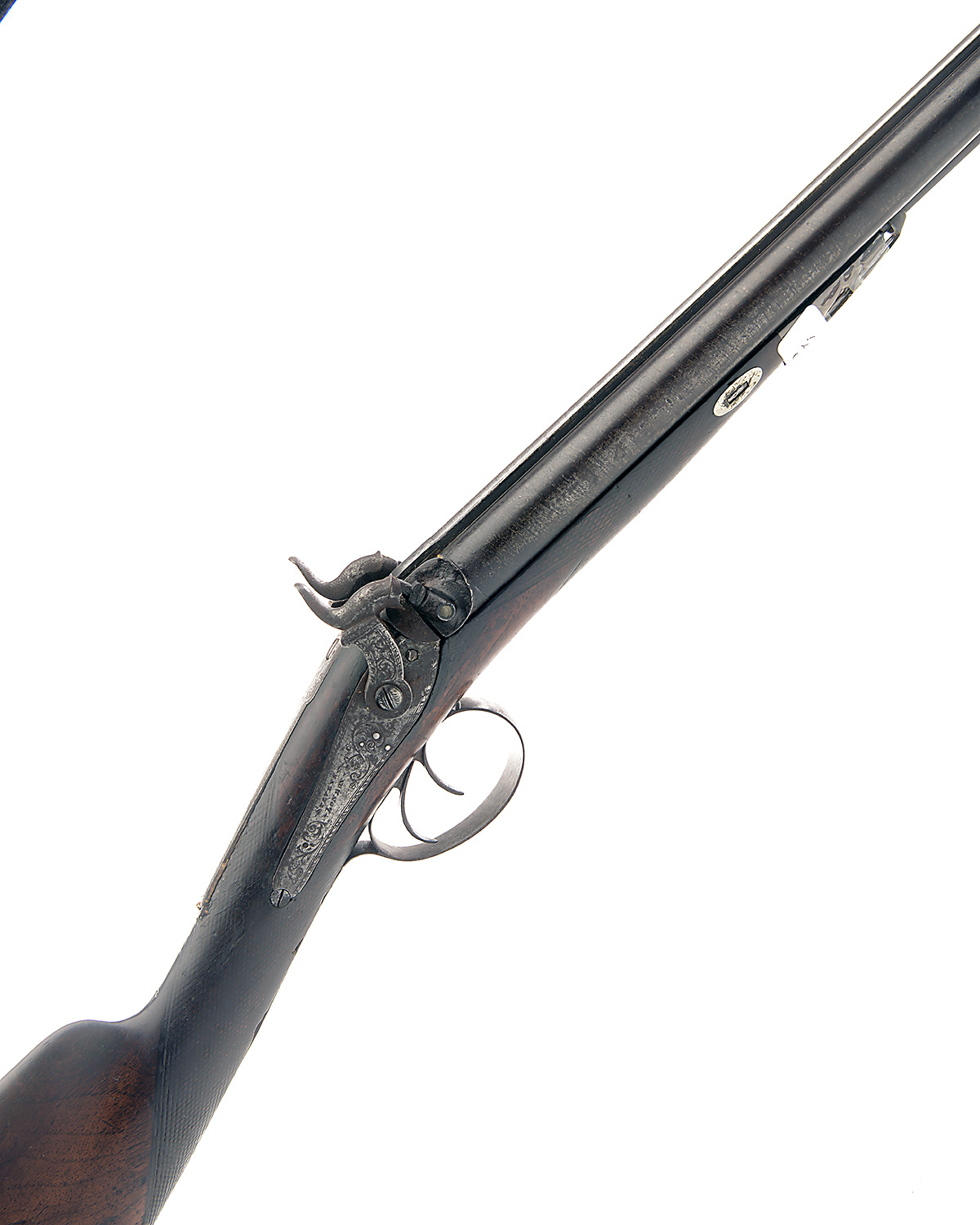 A 14-BORE PERCUSSION DOUBLE-BARRELLED SPORTING-GUN SIGNED STEVENS, LONDON, no visible serial number,