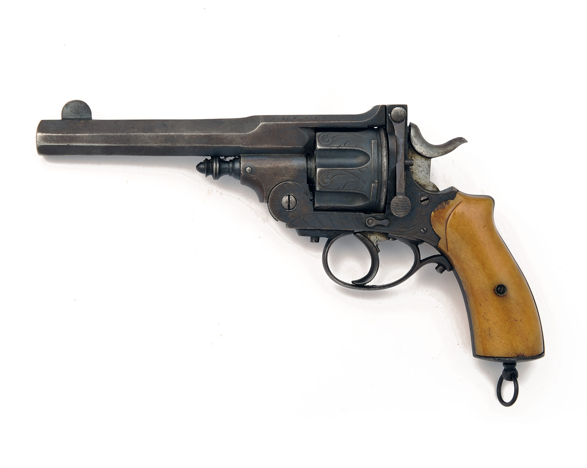 A .450 SIX-SHOT REVOLVER, UNSIGNED, MODEL 'PRYSE-ACTION', serial no. 4466, Belgian circa 1885, with octagonal 5 3/4in. barrel, break-open engraved frame, fluted cylinder with full ring extractor, smooth horn grips, refinished