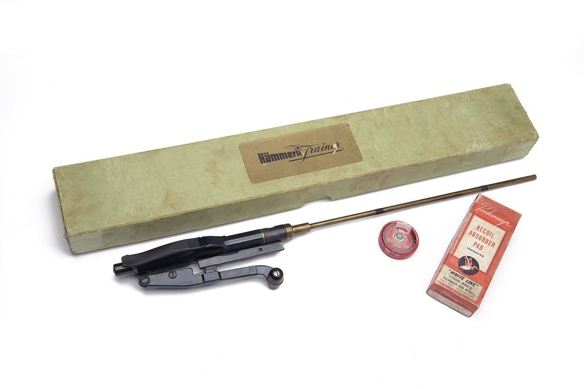 circa 1950, with 14 1/2in. brass barrel, blued air-chamber with integral six-shot magazine with rotating cover, the body of the device marked 'HAMMERLI TRAINER MOD K31', 'PATENT' ('Hammerli Trainer' with traces of gilt infill) and the serial number (some scratches to finish), side-lever cocking with bakelite toggle in imitation of the rifle together with its blacked top-clamp and complete in its makers pale green card carton with a partial tin of H&N BBs and a selection of spare parts from another unit
