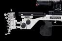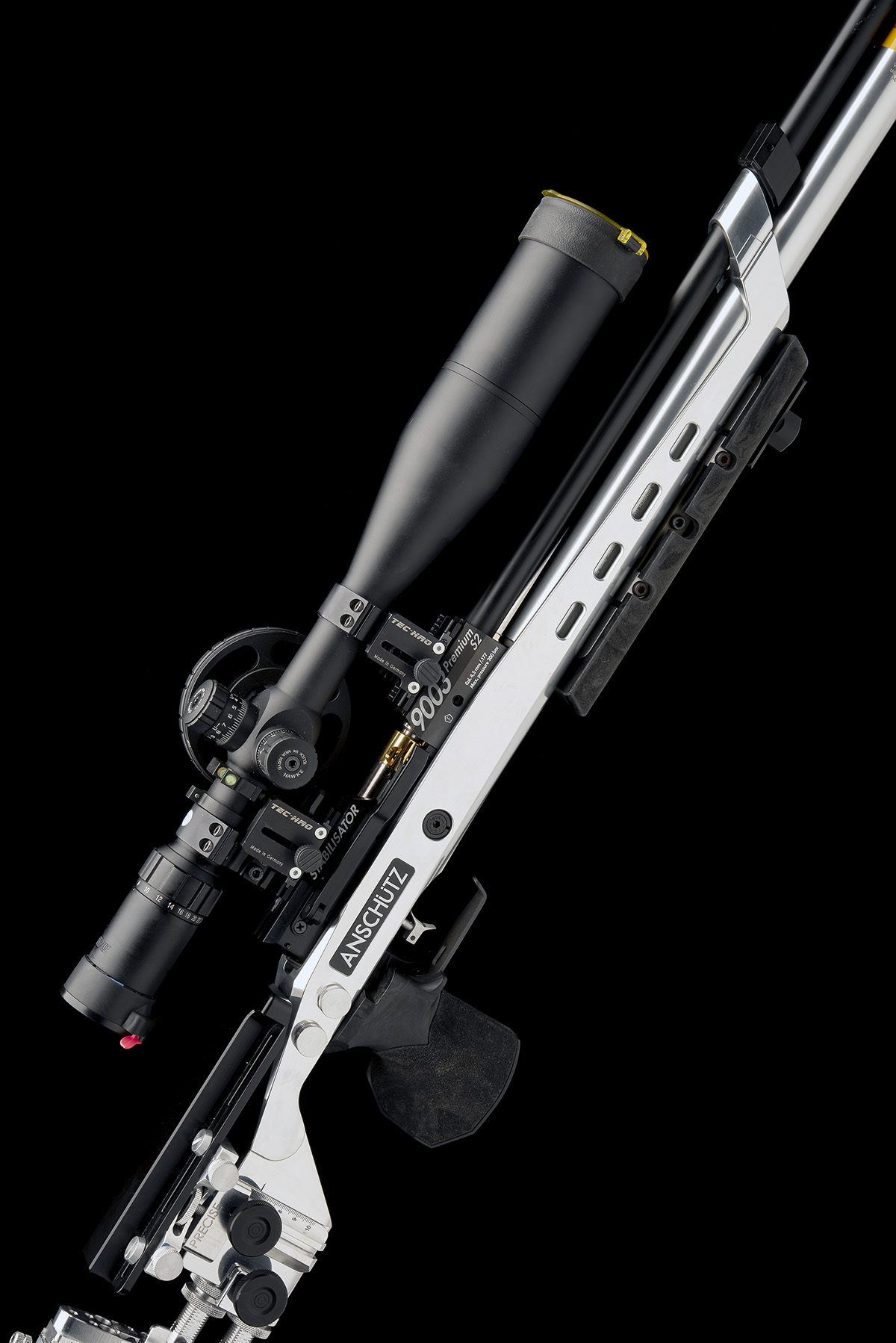 recent, with fully shrouded floating 25in. barrel, still-air muzzle with dove-tailed tunnel fore-sight for interchangeable elements (one included), machined black anodised receiver marked variously 'STABILISATOR' and '9003 S2 PREMIUM', with side-lever cocking the gold-coloured nitrided bolt, dove-tail telescopic sight rail with riser blocks, fully adjustable polished machined aluminium stock with micro-adjustable heel and adjustable comb, stippled kevlar right hand pistol-grip with adjustment scale and stippled kevlar front hand-grip with graduated accessory rail, satin finished air-reservoir with gauge to front and complete with a 'Precise' table bipod and a 'Javelin' Q/D carbon fibre bipod by Spartan Precision Equipment and fitted with a Hawke 30mm 6-24x56 'Sidewinder' telescopic sight with illuminating mill-radian graticule and over-size side-mounted parallax wheel in 'Sportsmatch' rings on micro-adjustable 'Tec-Hro' bases, together with an Anschutz trademarked abs plastic transit case and instructions