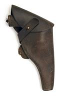 circa 1912, with 7 1/2in. blued barrel, blade fore-sight, drift adjustable rear-sight blade to stirrup barrel-latch, holster guides, blued fluted cylinder and frame, chequered walnut grips with small inlaid gold 'SAFE', iron lanyard ring, and a strong amount of original blued finish (faded, some spotting), in a period brown leather flap holster