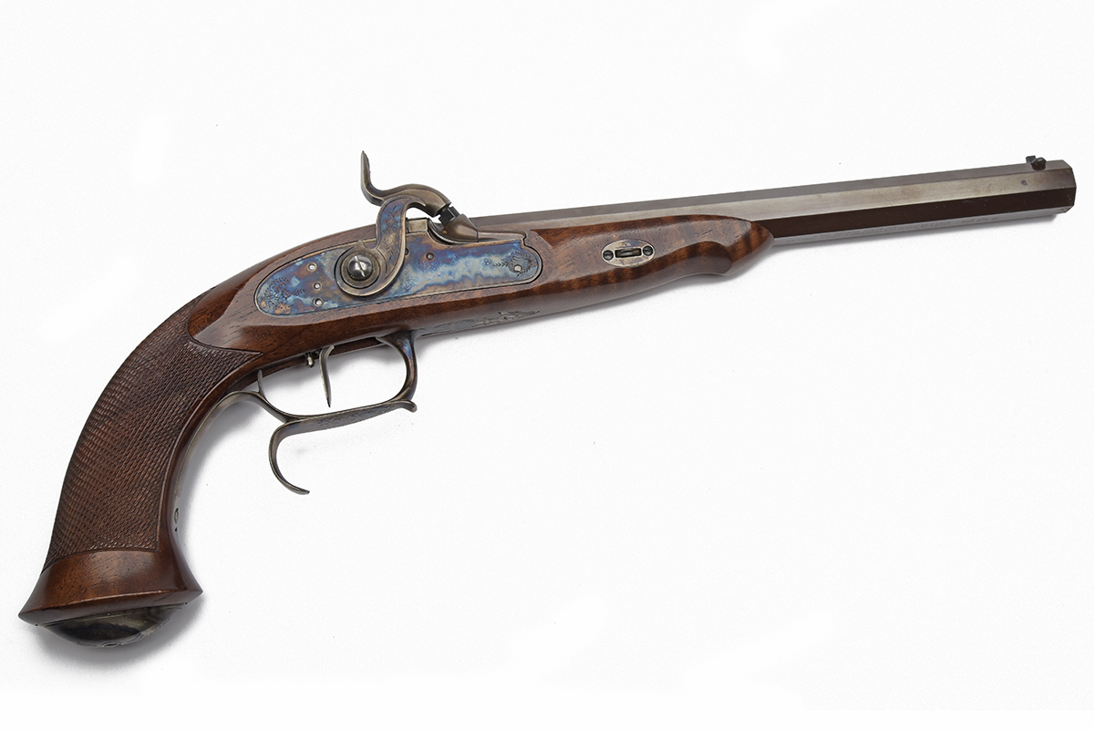 A REPRODUCTION .44 PERCUSSION -PISTOL SIGNED PEDERSOLI, MODEL 'LE-PAGE', serial no. PD18395, with browned octagonal 10in. rifled barrel, colour hardened bar-action locks and walnut half-stock with chequered butt and set-trigger