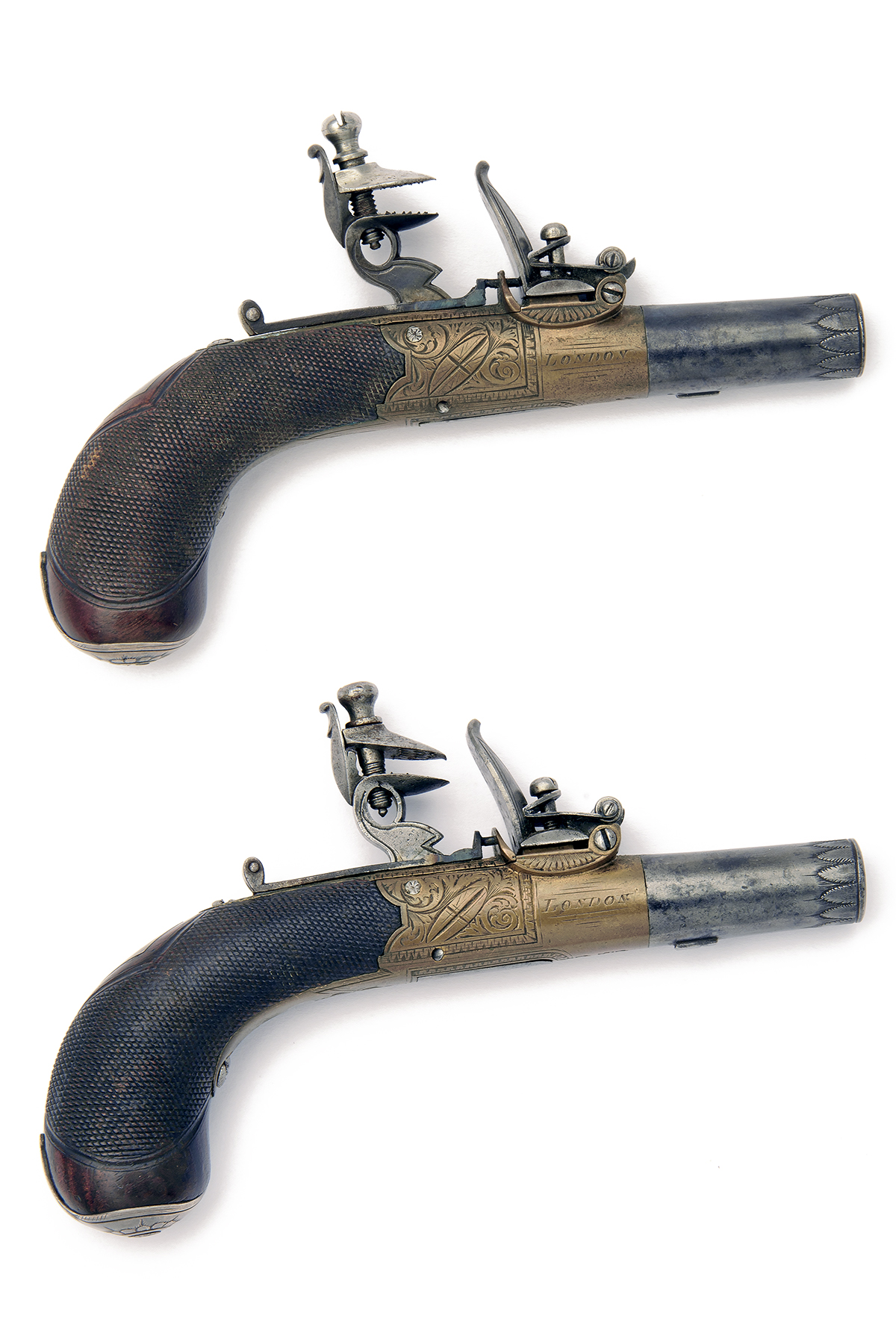 circa 1825, with round iron turn-off 1 3/8in. barrels (frozen), broad engraved band at the muzzles, round brass bodies with London proofs, border, scroll and shield engraved actions, central cocks with concealed automatic triggers and rainproof pedestal pans, sliding safes to the top-straps, finely chequered walnut bag-shaped butts with engraved white-metal caps, fair traces of finish remaining