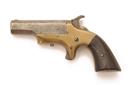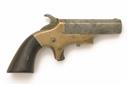 circa 1872, with octagonal 2 3/8in. barrel, the left side signed 'BROWN MF'G CO, NEW BURYPORT, MASS' and an illegible patent date, plain bronze frame with push button barrel release, central hammer, spur trigger and smooth flared walnut grips, finish lost to barrel