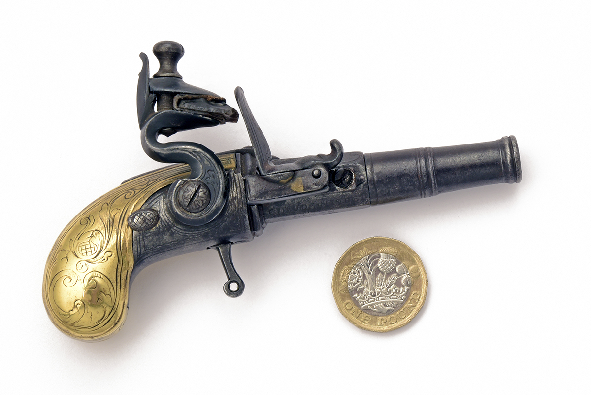 A RARE 250-BORE FLINTLOCK RIFLED POCKET-PISTOL, MODEL 'BABY QUEEN ANNE', no visible serial number,