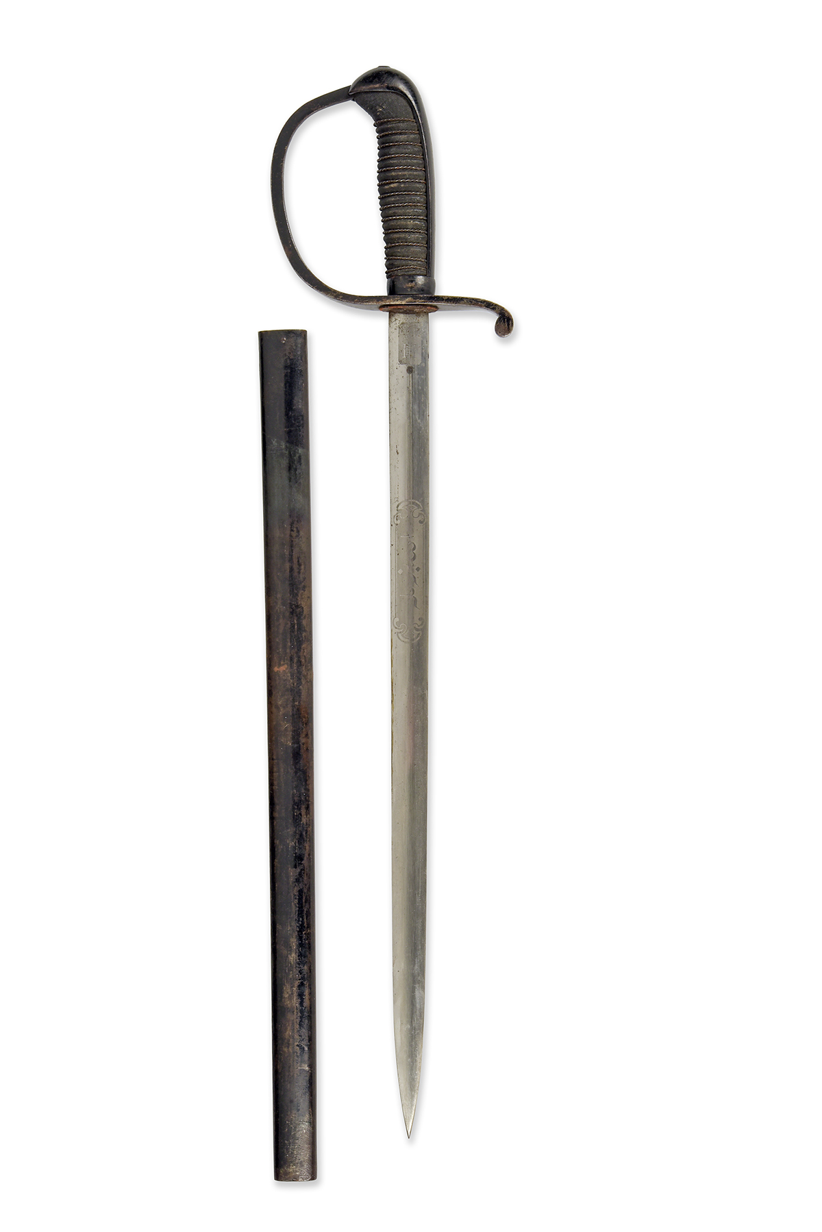 E.F HORSTER, SOLINGEN A SCARCE 1909 PATTERN TURKISH N.C.O'S SHORT-SWORD or HANGER, no visible serial number, manufactured before World War One, with straight double-edged 17in. blade of flat oval profile, both sides etched with panels of Turkish script, 'Horster' signature at forte, blacked iron 'D' shaped hilt with single rolled quillion, wire-bound fishskin grip and iron back-strap with doveshead pommel, complete with its square ended iron scabbard.