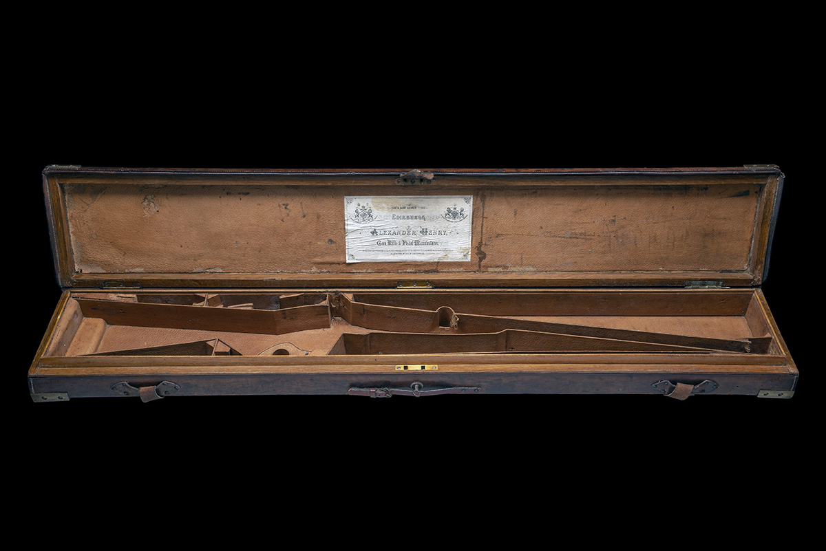 probably a .360, the leather exterior with triple borderline embossed lid, pierced brass corners, replacement straps and rear-mounted carry handle, the pigskin lined interior with compartments for turn-screws, oil bottles and accessories, the inside of lid with 'South Saint Andrew Street' parchment label (lid panel starting to detach from frame), complete with key, interior rifle compartment 42 1/2in. overall