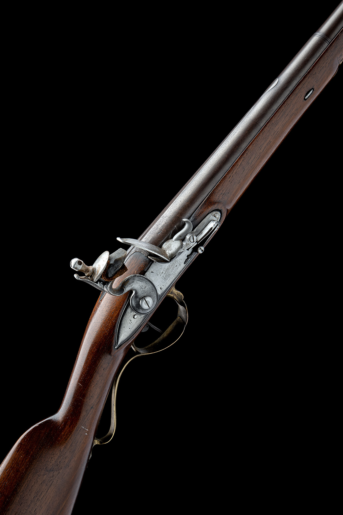 37 1/4in. round two-stage barrel carved with a needle and tear-drop short sighting-rib with traces of signature, applied spider fore-sight, engraved top-tang with shallow sighting groove, flat, rounded lockplate with moulded border (cleaned, traces of signature), lined touch-hole, rainproof pan (lock reconverted), later replacement top-jaw and screw, replacement walnut full-stock (fore-end spliced at ramrod throat) with raised cheek-piece, brass furniture including ribbon sideplate and competent replacement ramrod