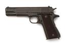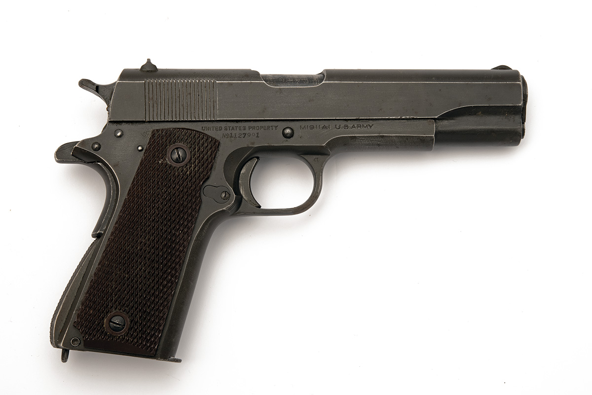 for 1943, with 5in. barrel, grey phosphated frame and slide, the latter with maker's address and patents, the former with 'M1911A1 U.S. ARMY' and 'UNITED STATES PROPERTY', 'G.H.D.' inspector's stamp (George H. Drury), grip safe, chequered dark brown plastic grips and original magazine with two-tone finish