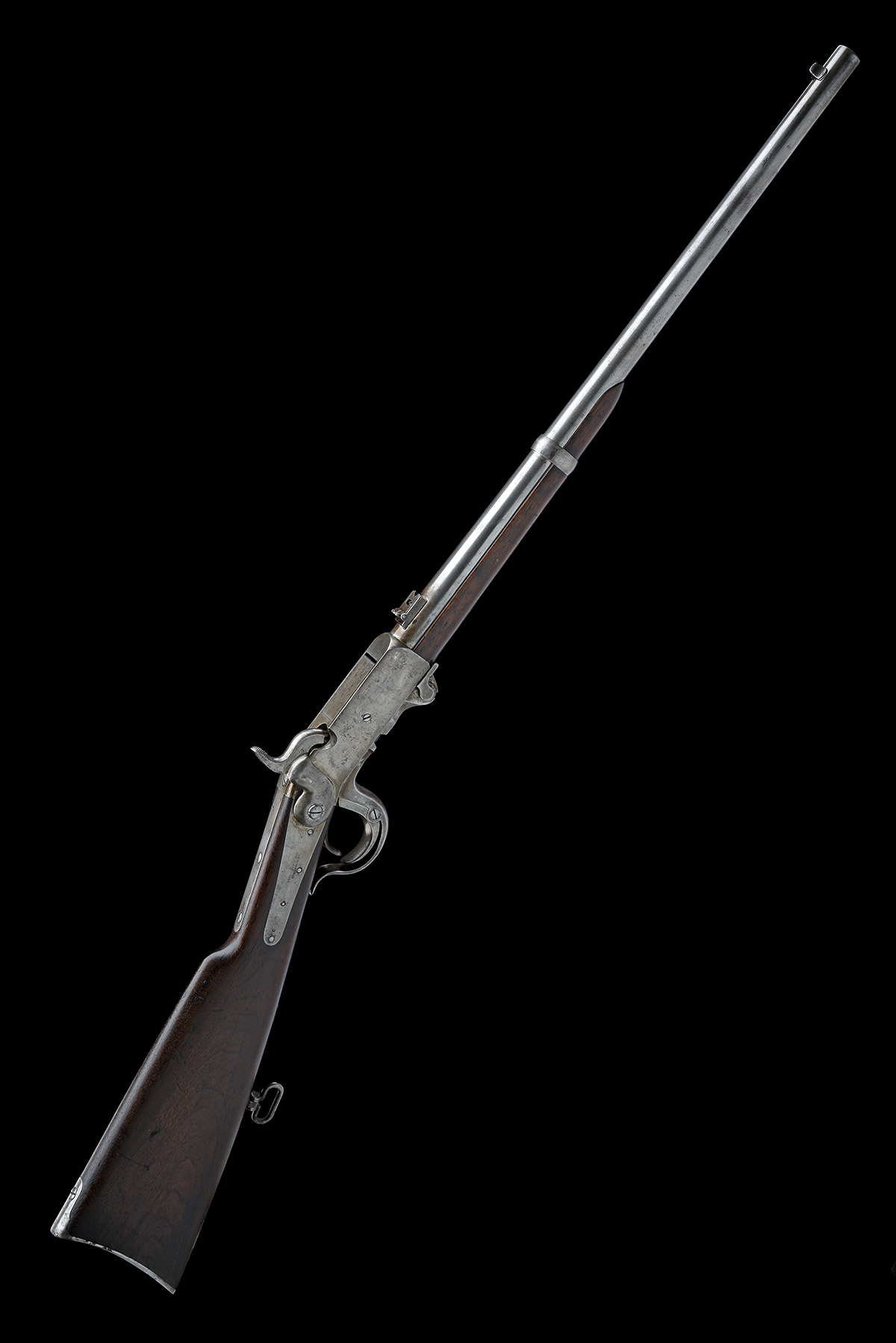 with 21in. barrel fitted with pinched blade front-sight and leaf battle rear-sights to 500 yards, the breech top stamped 'BURNSIDE PATENT / MODEL OF 1864', (faint), breech block and action stamped with the serial number 39,355, and for the convenience of the trooper a side-rib is fitted to the left-side of the action, back-action lock stamped in small letters 'BURNSIDE RIFLE CO. / PROVIDENCE R.I.', two piece iron mounted walnut stock, the splinter forend with one spring retained band, the butt with crescent butt-plate