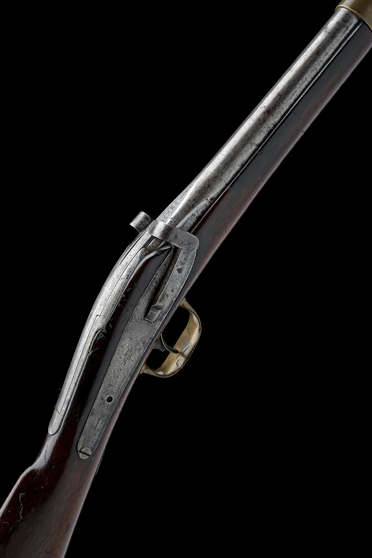 with 24in. smoothbore barrel, stamped at the breech 'AMES / U.S.N / R.C. / P / 1845', the action features a lever, lifting it and drawing it back withdraws a plunger allowing the carbine to be loaded with powder and ball through a small loading port in the top of the breech, the lock is of a unique design with a sidehammer its advantage being less moving parts, the lockplate stamped 'N. P. AMES / SPRINGFIELD / MASS' on the centre and on the tail 'WM JENKS', brass mounted full walnut stock with two brass barrel bands the top band with blade front-sight, repair to wrist