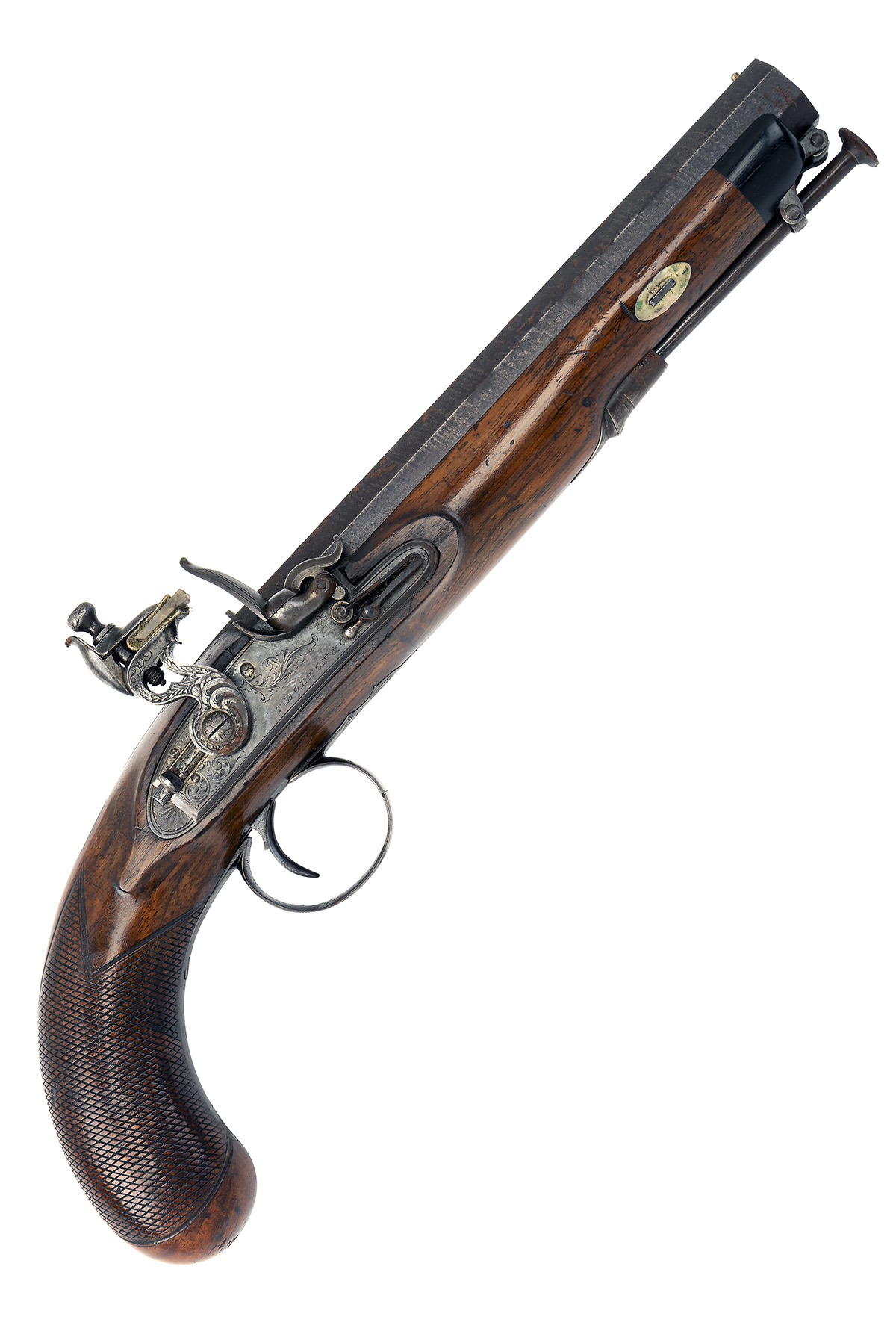 circa 1815, with browned octagonal 8in. barrel (some staining), the top-flat marked 'LONDON', bead fore-sight, shallow standing notch rear-sight, engraved top-tang, platinum line and touch-hole at breech, borderline engraved bevel edged lock with engraved stepped tail and signed 'BOLTON' below the semi rainproof pan, engraved pierced cock with safety, roller spring for the frizzen, walnut full-stock with chequered bag-shaped grip, blued iron furniture, clipped corner white metal rectangular escutcheon to wrist, ebony fore-end tip and captive iron stirrup ramrod, strong traces of finish