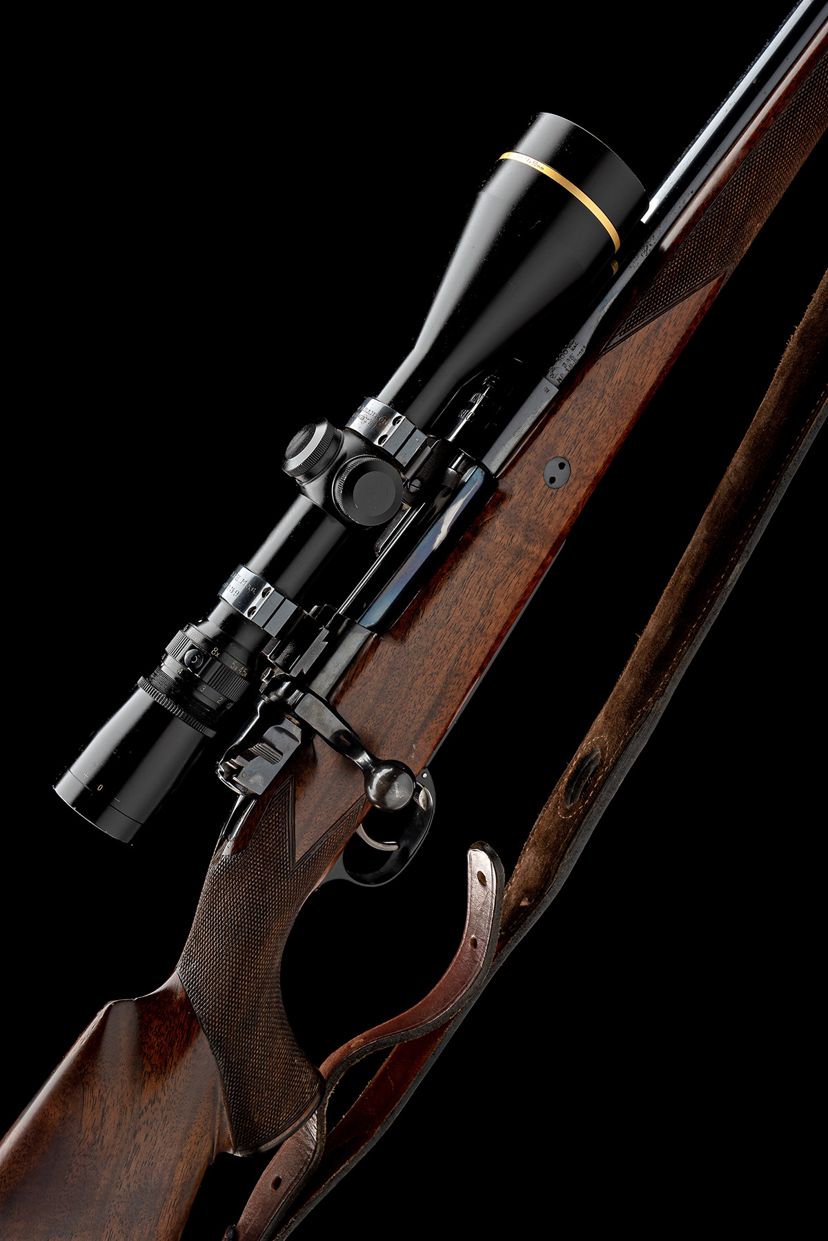 circa 1990, 23 3/4in. unsighted nitro barrel engraved 'RONALD WHARTON (FROM RIGBY'S), RUSPER, WEST SUSSEX. ENGLAND.', the receiver ring engraved '.300 H&H MAGNUM "AFRICAN"', the receiver (with thumb cutout) mounted with a Leupold VX-III 4.5-14x50mm telescopic sight, serial no. 209321N, in quickly-detachable mounts, the rings engraved 'RONALD WHARTON (FROM RIGBY'S)' and '.300" H&H MAG. No. 0039', the side wall with partial Mauser detail 'OBERNDORF A/N', bolt with gold arrow and 'SAFE' details, recoil blocks, hinged straddle floorplate with push button release, figured pistolgrip stock with cheekpiece, horn pistolgrip-cap and finial, sling swivels, 13 1/4in. pull including 7/8in. recoil pad, weight 7lb. 11oz. (unscoped) and 8lb. 13oz. (with scope)