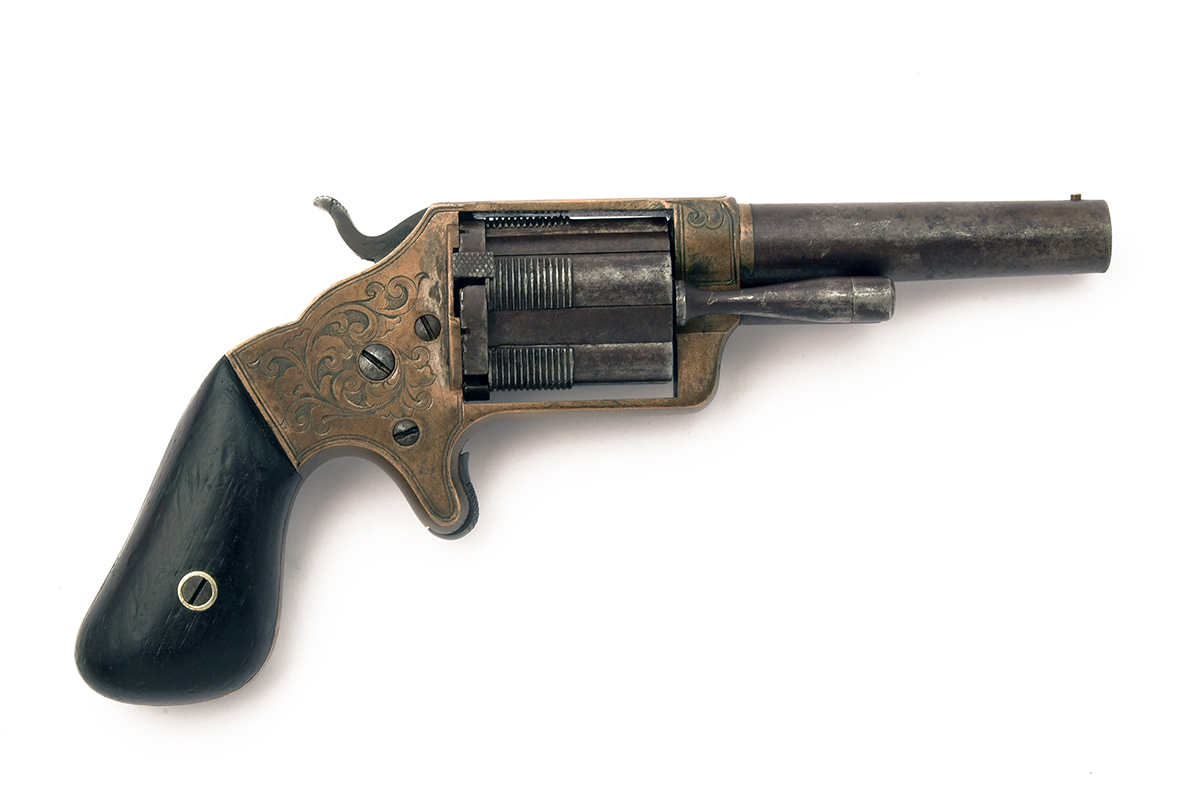 with 3in. round barrel, the top stamped 'B. A. CO PATENT APRIL 14TH 1863', foliate engraved brass frame with sheath trigger and two piece rosewood grips, five shot cylinder of a unique design with individual chambers in the form of sliding tubes with cutouts in the cylinder, the tubes slide forward one at a time over a fixed rod on the right-side to expose, load and eject