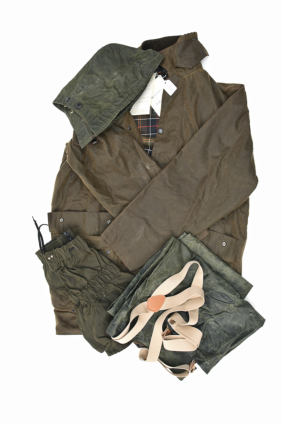 A BARBOUR WAX JACKET WITH WAX OVER TROUSERS WITH BRACES AND WAX GAITERS,