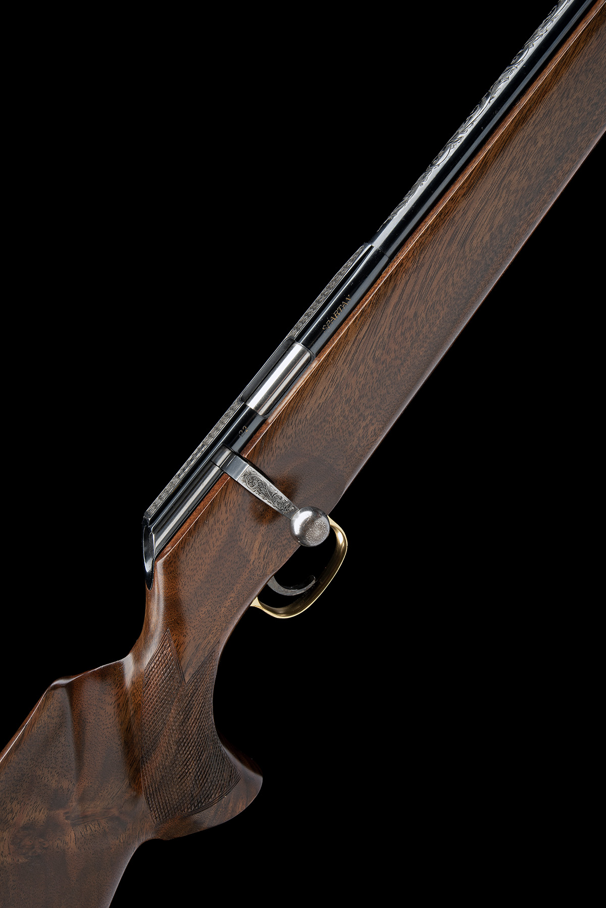 circa 2008, with mirror-blued and tapering 25in. barrel engraved along the full length of the upper surface with bold acanthus scrolls by Don Blocksidge, twin gold bands at muzzle, blued bolt-action receiver with integral rail for a telescopic sight engraved with geometrics within a borderline panel, the left side of the receiver with a further panel of bold acanthus scrollwork, in the white highly polished turned down bolt-handle engraved with scrolls, figured walnut anatomical right hand half-stock chequered at the grip and fitted with a stippled rubber heel-pad, colour hardened trigger blade within a lacquered brass trigger-guard, brass-lined aperture for filling probe near fore-end tip (probe included) and barrel mounted eyelet for a bipod (absent), light marks only to wood otherwise appearing little used and complete in a fitted full-length Browning rifle case