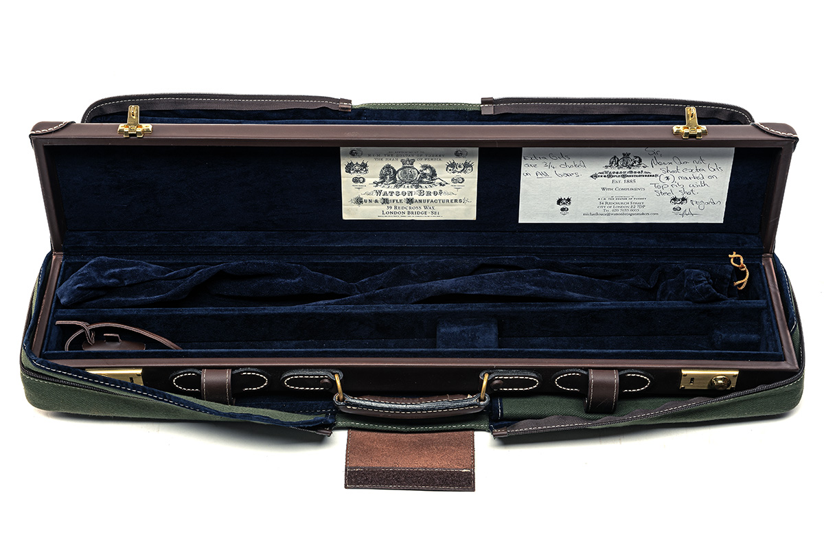 fitted for 27 1/2in. barrels, the interior lined with navy blue velvet, a Watson Brothers trade label, two brass locks (including key), green canvas outer