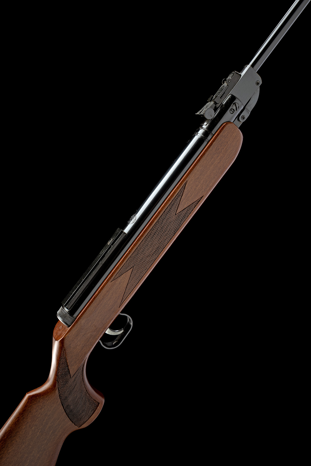 with blued and sighted 19in. barrel, blued air-chamber with applied telescopic sight rail, press-chequered beech half-stock with rubber heel-plate and alloy trigger, complete with its maker's inner and outer card carton with polystyrene packing pieces