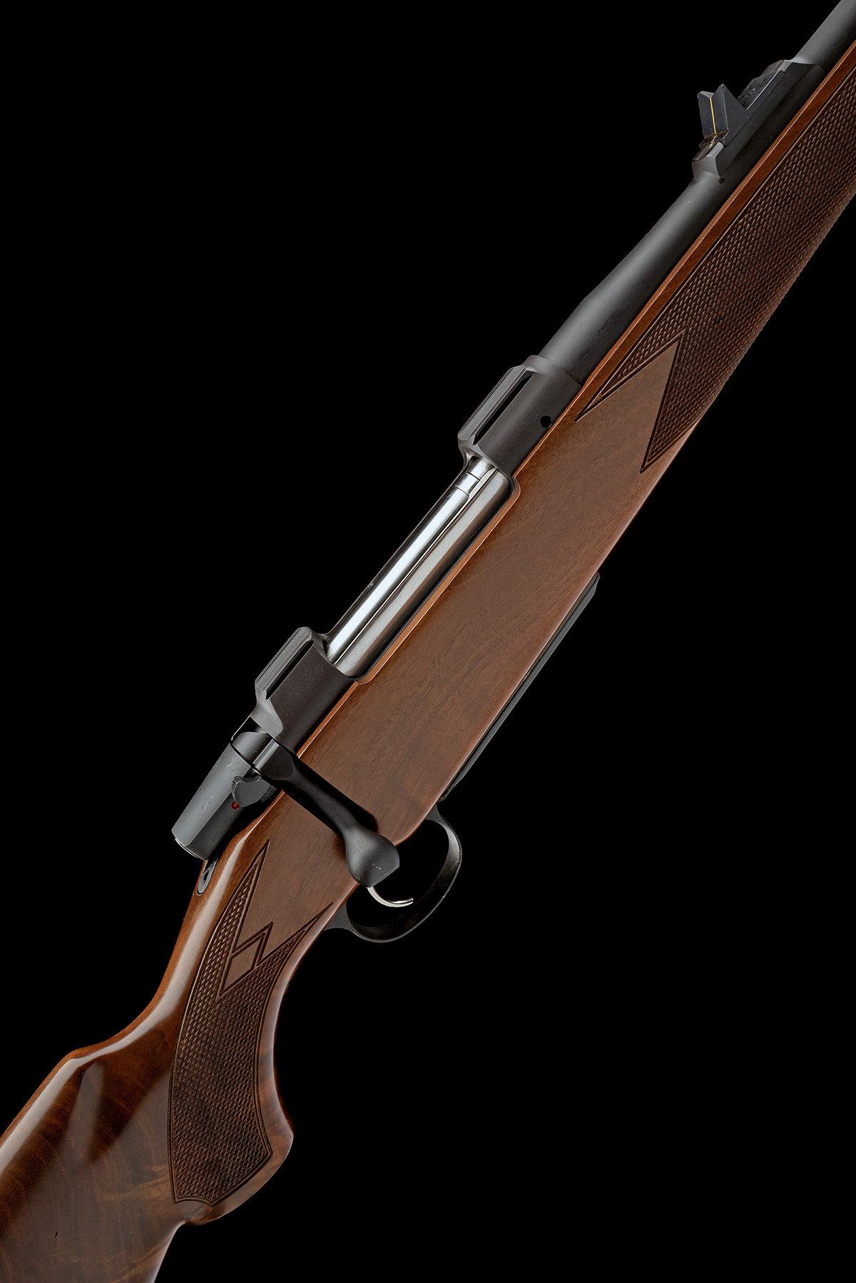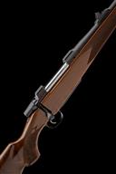 for 2004, 23 1/4in. nitro barrel with ramp-mounted bead fore-sight, block-mounted notch rear sight, manual safety, hinged floorplate with push-button release, set-trigger, figured walnut pistolgrip stock with sculpted cheekpiece, 14in. pull including rubber recoil pad, sling eyes, weight 10lb. 8oz.