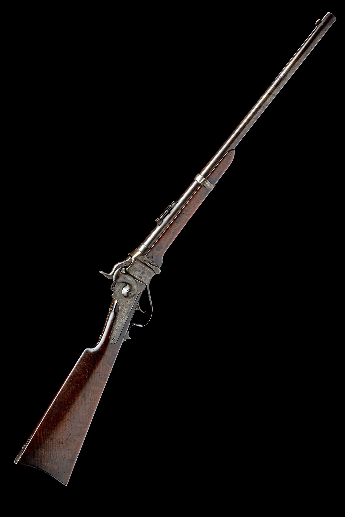 circa 1874, with 22in. barrel rifled with three grooves, block and blade front-sight and ladder rear-sight, the lock stamped 'SHARPS PAT / OCT. 5TH 1852' to the centre and below the pellet primer 'R. S. LAWRENCE PAT / APRIL 12TH 1859', the action tang stamped with the serial number C.25,222, iron mounted two-piece walnut stock, half fore-end secured by one spring retained barrel band