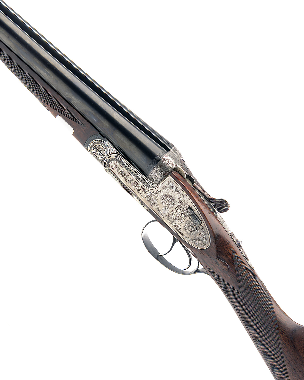 ARMAS GARBI 12-BORE 'BLACK SABEL DE LUXE' HAND-DETACHABLE SIDELOCK EJECTOR, serial no. 13159, 26 3/4in. nitro barrels, 2 3/4in. chambers, bored approx. imp. cyl. and 1/2 choke, removable striker discs, automatic safety, hand detachable lockplates, cocking indicators, articulated front trigger, bouquet and scroll engraving, brushed bright finish, 14 1/2in. stock, weight 6lb. 6oz.