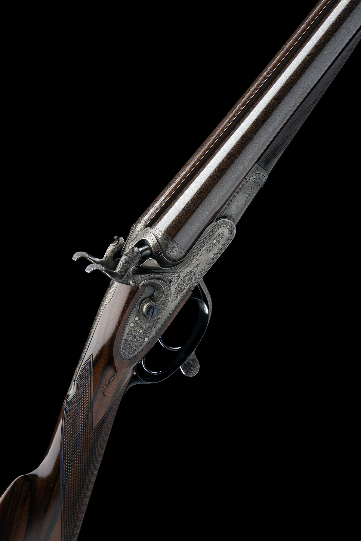 circa 1874, 30 7/8in. nitro reproved bold damascus barrels (slightly shortened), rib engraved 'Wm. NEEDLER. MAKER. HULL.', (likely refreshed), 2 5/8in. chambers (67mm), bored approx. true cyl. and imp. cyl. choke, sculpted Jones patent rotary underlever, carved percussion fences with button strikers, rebounding sidelocks with ornately carved hammers, fine feathered border and acanthus scroll engraving, 14 3/8in. highly-figured replacement stock, fore-end with sculpted horn finial (light damage) with Anson 1873 patent release, weight 7lb. 10oz.