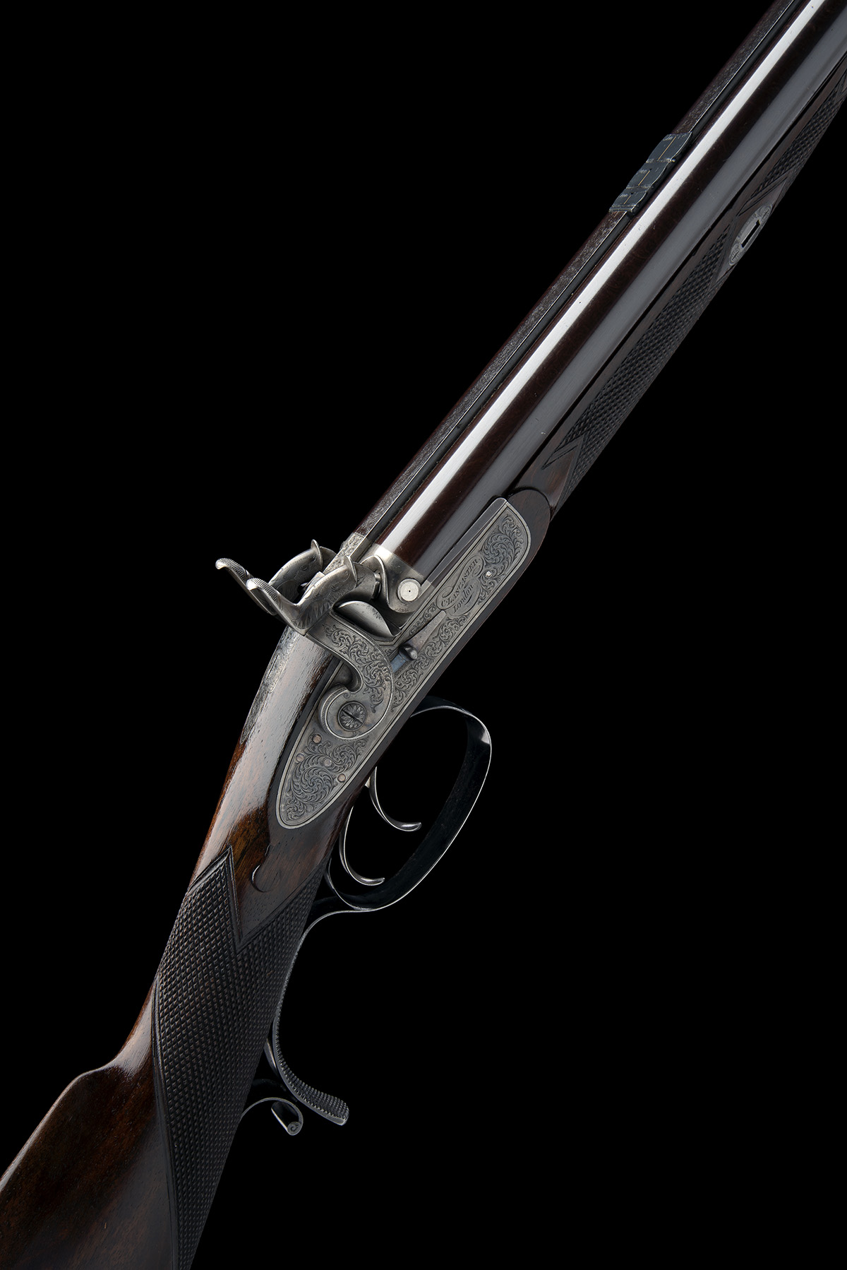 for 1858-59, with browned 31in. damascus barrels, blade fore-sight, dove-tailed rear-sight with three folding blades, platinum line and engraved rib-end to the colour hardened breech, vented platinum plugs, borderline and scroll engraved colour hardened bar-action locks signed in banners 'C. LANCASTER, LONDON', sliding safes forwards of the engraved dolphin headed hammers, chequered walnut half-stock with inlet colour hardened iron patch-box to rear of right hand side of butt, the lid engraved with a herd of deer led by a stag, the hinge engraved with scrolls, chequered iron heel-plate with scroll engraved top-spur also featuring a standing gundog, trigger-guard tang with chequered pistol-grip spur, rutting stags engraved to the trigger-guard bow, pineapple finial and ramrod throat and original brass-mounted ebony ramrod, the whole retaining much apparently original finish and colour, complete with its original oak storage case lined and compartmented in green baize, original parchment trade-label attached to inner lid and containing a number of period accessories including the original numbered mould, shaped wad-punch and leather covered powder-flask, leather sling, caps and a ball-starter