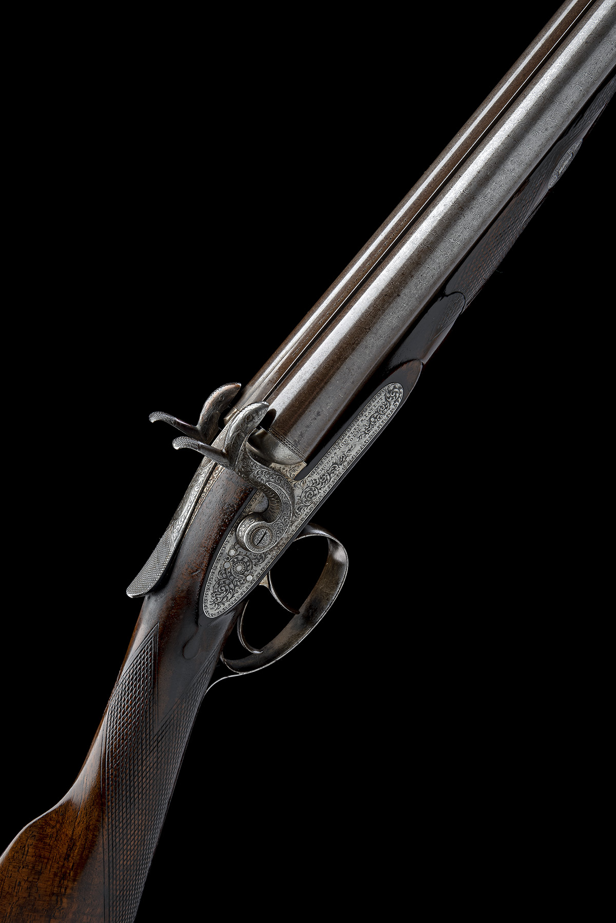 circa 1864, 30in. damascus barrels, rib engraved 'THOMAS HORSLEY. MAKER. YORK. PATENT', bar-in-wood, Horsley No.2 patent pull-back toplever engraved 'PATENT', patent no. 2410 of 1st October 1863, non-rebounding sidelocks with dolphin hammers of pinfire form, 14 1/4in. stock including partially engraved steel buttplate, weight 7lb. 8oz.