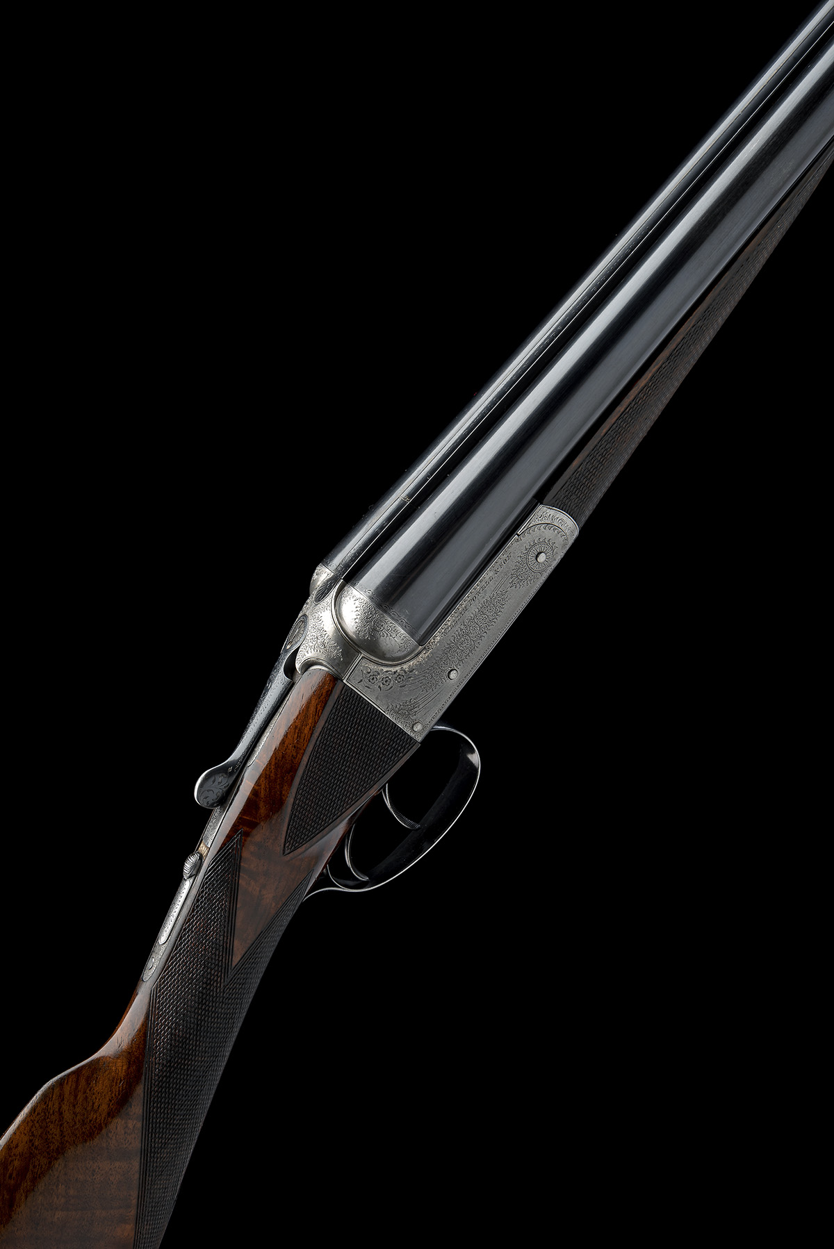 circa 1897, 28in. replacement nitro reproved barrels (wall thicknesses well below recommended minimum, ejectors require attention), rib engraved 'Wm. POWELL & SON. CARR'S LANE. BIRMINGHAM.', 2 1/2in. chambers, bored approx. 1/4 choke in both, treble-grip action, toplever engraved '2', automatic safety, border and partial acanthus scroll engraving with a further floral spray, 14 3/8in. figured stock with chequered side panels, weight 6lb. 2oz.