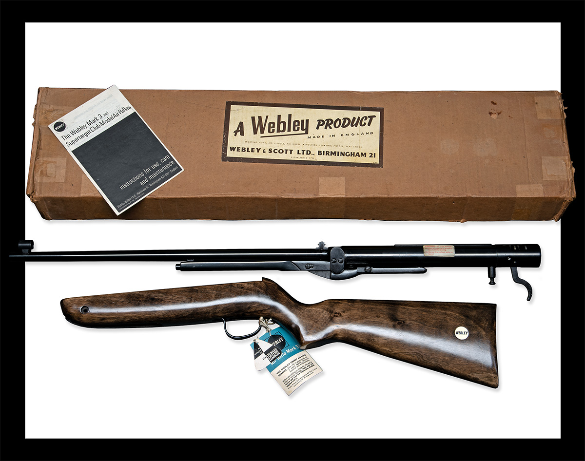 for 24th August 1974, with 18 1/2in. blued barrel, open sights, the fore-sight retaining its tunnel protector, blued air-chamber with applied rail for a telescopic sight and walnut half-stock, the whole in unassembled, unfired near mint condition with all numbers and details still retaining traces of white paint, all warning labels and swing tickets intact and complete in grease-proof paper within a card carton with instruction leaflet and buff printed outer 'Webley' label