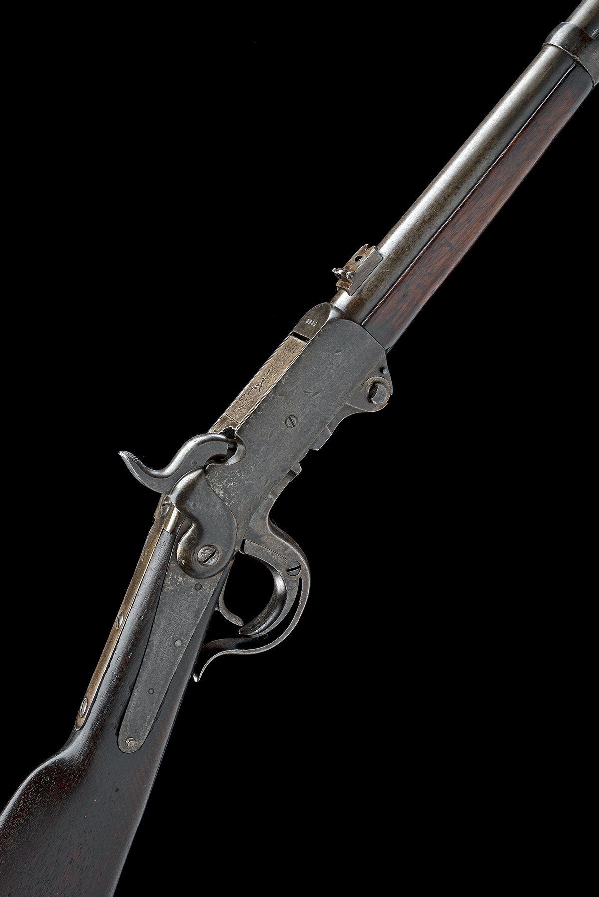 with 21in. barrel fitted with pinched blade front-sight, and leaf battle rear-sights to 500 yards, the breech top stamped 'BURNSIDE PATENT / MODEL OF 1864', (faint), interestingly although marked "Model of 1864" deliveries started in 1863 and this is one of the early deliveries from that year, breech block and action stamped with the serial number 6954, and for the convenience of the trooper a side-rib is fitted to the left-side of the action, back-action lock stamped in small letters 'BURNSIDE RIFLE CO. / PROVIDENCE R.I.', (faint), two piece iron mounted walnut stock, the splinter fore-end with one spring retained band, the butt with crescent butt-plate