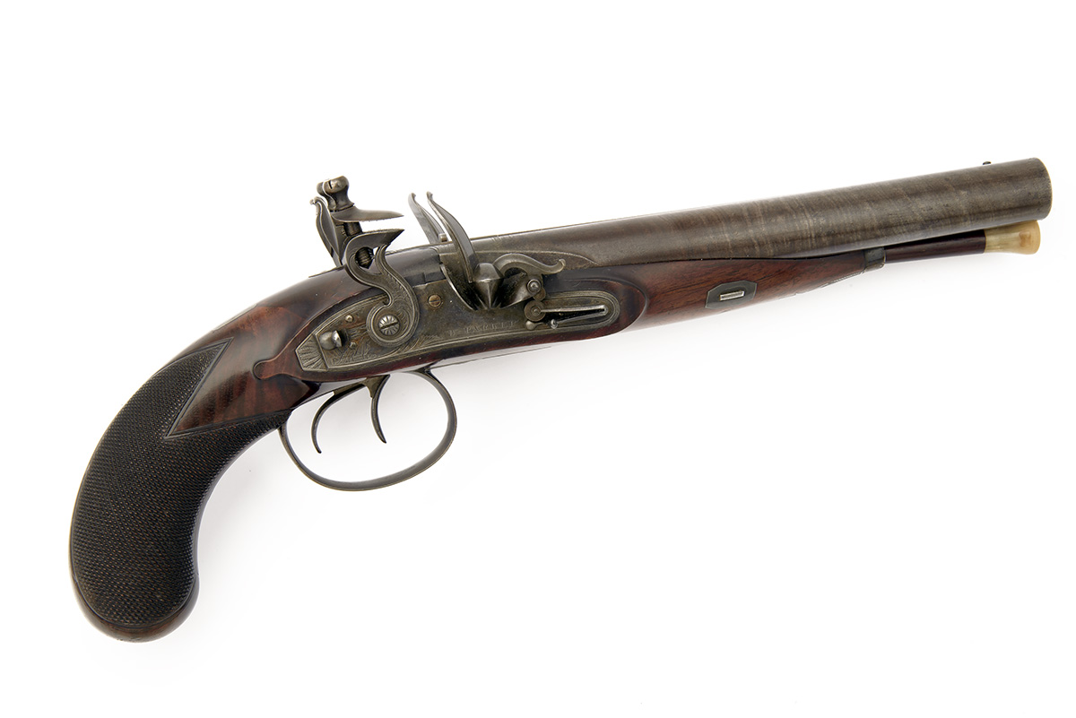 A GOOD .65 DOUBLE-BARRELLED FLINTLOCK OFFICERS PISTOL BY W. PARKER CIRCA 1810, no visible serial number,