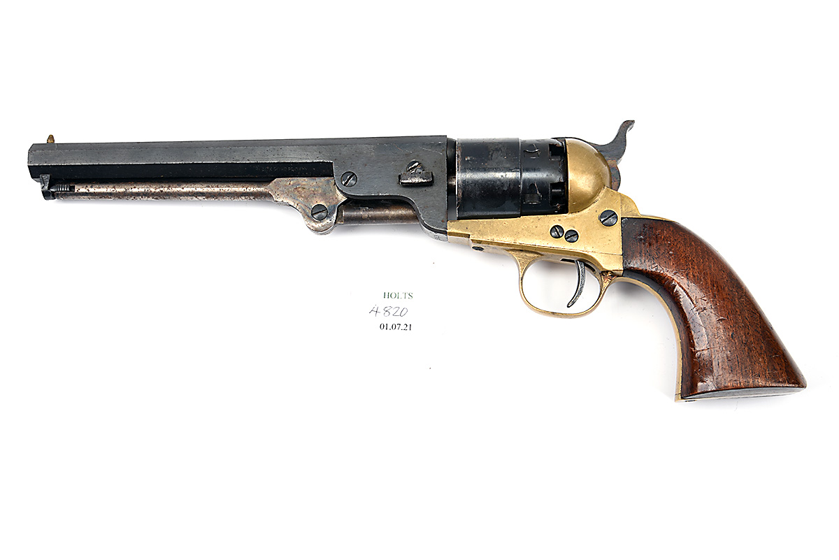 A REPRODUCTION .44 PERCUSSION REVOLVER SIGNED ITALY, MODEL '1860 REBEL ARMY', serial no. 553, with blued octagonal 7 1/4in. barrel, plain blued stepped cylinder, open brass frame and smooth walnut grip, 13 3/4in. overall