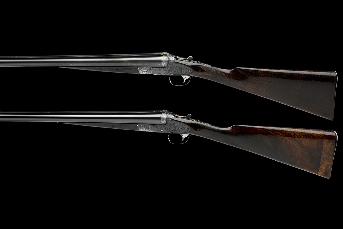 circa 1900, 30in. nitro barrels, ribs engraved 'COGSWELL & HARRISON LTD. EXTRA QUALITY VICTOR EJECTOR. 141 NEW BOND ST. LONDON.', and gold-inlaid '1' and '2' at the breech ends, No.1 rib loose, 2 1/2in. chambers, bored approx. imp. cyl. in all, No.2 wall thicknesses at 16, treble-grip actions, toplevers gold-inlaid '1' and '2', automatic safeties with gold-inlaid 'SAFE' details, beaded border and acanthus scroll engraving, retaining traces of blacked finish, 15 1/4in. stocks (No.2 including 1 1/4in. wooden extension), weight 6lb. 9oz (No.1) 6lb. 12oz. (No.2), in their brass-cornered oak and leather case