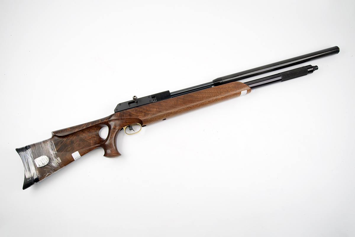AN FAC-RATED .22 PRE-CHARGED PNEUMATIC AIR-RIFLE SIGNED BSA, MODEL 'STALKER CUSTOM', serial no. DP12117, being a professionally customised BSA Super Ten model, with 26 1/2in. barrel including extra length carbon-fibre sound moderator, bolt-action receiver with special brass custom plaque, deluxe walnut thumbhole stock and extended under-barrel air-reservoir, tested, 45in. overall, with two magazines