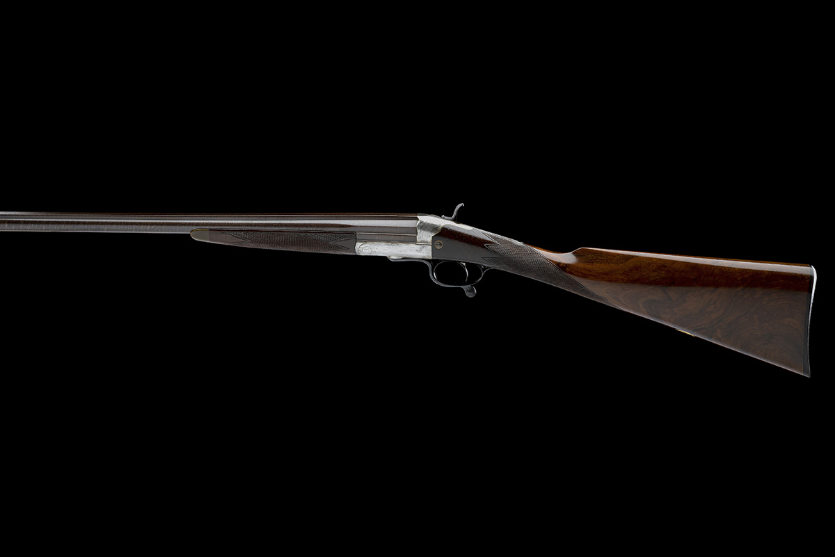 circa 1875, 30in. nitro reproved bold damascus barrel (in 1972), raised solid file cut top-rib with a banner engraved 'ADSETT. CANTERBURY', 2 1/2in. chamber, bored approx. 1/2 choke, Jones patent rotary underlever, carved percussion fence, rebounding back-action lock with a scrolling banner engraved 'ADSETT. CANTERBURY' in gothic script, brushed bright and reblued finish overall (some surface patination), 14in. stock including horn buttplate, weight 4lb. 5oz.