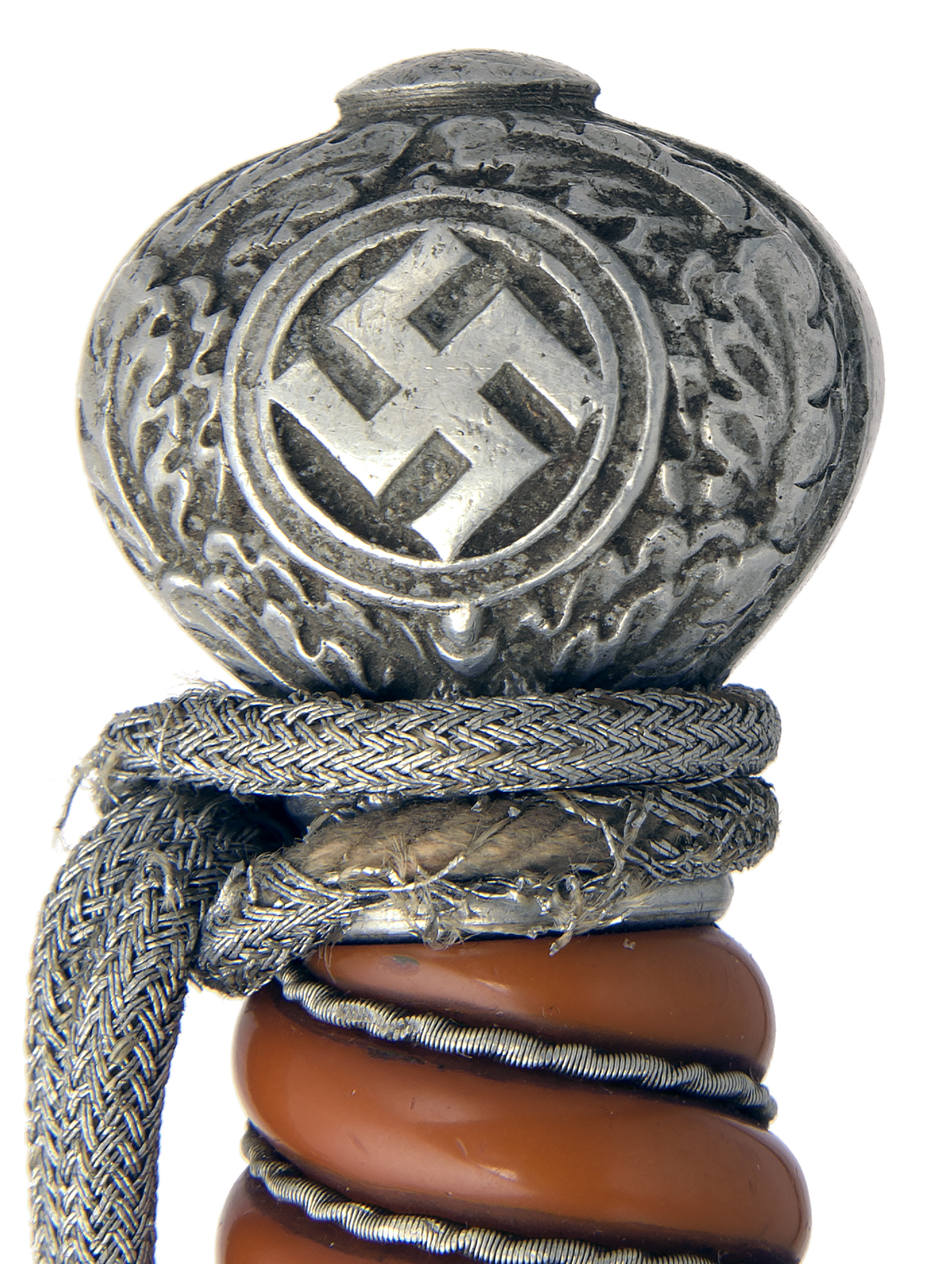 circa 1939, with plain stiletto 9 3/4in. blade, finely detailed aluminium crossguard in the form of an eagle with out-stretched drooping wings clutching a swastika in its talons, the reverse pebbled and the top-surfaces carved with oak-leaves, orange-coloured celluloid grip with spiral wire binding and bulbous swastika alloy pommel, complete with its correct pebbled scabbard, twin suspension rings and its bullion portapee knot