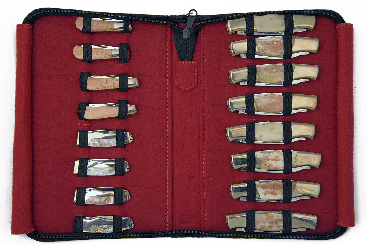 assorted repeated designs and scale materials, many multi-bladed, the largest 5 3/4in. closed, all appearing unused, in three red felt lined zip-up cordura collector's cases with elasticated loop retainers