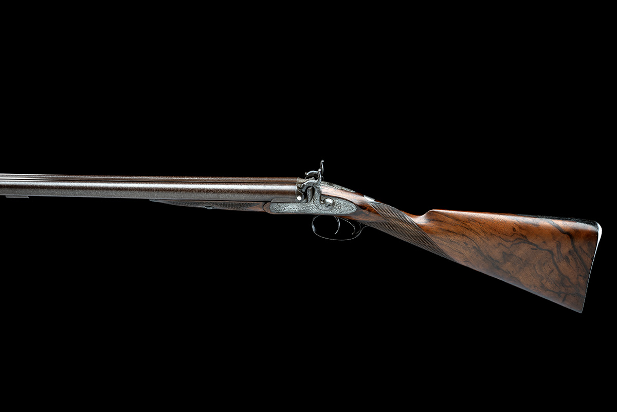 circa 1860, with 31in. browned damascus barrels, the top-rib signed 'RICH'D JACKSON 30 PORTMAN PLACE, EDGEWARE ROAD' (rubbed but legible), bead fore-sight, scroll engraving to rib-end at breech, platinum line and vented plugs to the colour hardened breech-blocks, fully scroll engraved top-tang, border and scroll engraved bar-action locks signed 'JACKSON LONDON' and featuring gamescenes of a hunting dog on the left lock and gamebirds on the right, chequered walnut half-stock with engraved iron furniture including a further gundog engraved to the triggerguard bow, fully engraved ramrod throat, missing ramrod