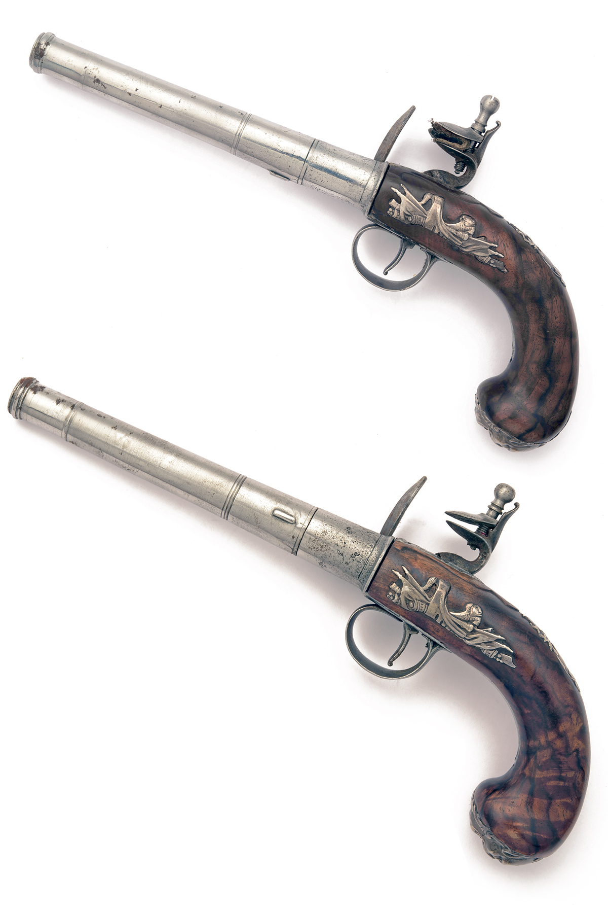 circa 1765, with turn-off tapering 5 1/4in. cannon barrels (one heavily cleaned with loss to detail, the other possibly replaced), traces of London proofs, the top of breech-blocks signed 'GRIFFIN', the undersides 'BOND ST LONDON' (all rubbed), typical side-cock boxlock actions with recumbent 'L' shaped frizzen springs (one cock, both frizzens and one spring replaced), walnut butts with bag-shaped grips (both possibly replaced), white metal rococo escutcheons at wrist, white metal martial trophy sideplates and grotesque mask butt-caps, both trigger guards replaced