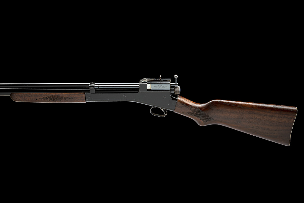 circa 1935, with black painted 20in. barrel, bolt action blued breech marked 'MFD BY CROSMAN ARMS CO. ROCHESTER N.Y. on the left side and 'CROSMAN .22 PAT. OCT. 28 1924, OTHER PATENTS PENDING' and fitted with ten-shot tube magazine, black painted alloy receiver, knurled cocking piece to rear, peep-sight to top of breech, wood semi pistol-grip butt-stock with colour-hardened heel-plate, chequered wood fore-arm, the whole retaining the majority of its factory finish and generally in collector's external condition