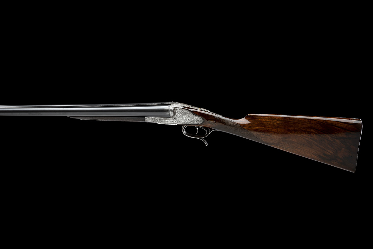 circa 1884, 28in. sleeved nitro barrels, broad rib engraved in gothic script 'JNO. RIGBY & CO. 72, ST. JAMES'S STREET. LONDON AND DUBLIN', (refreshed), 2 1/2in. chambers, bored approx. true cyl. and 1/4 choke, action incorporating J. Rigby and T. Bissell patent rising third bite, patent no. 1141 of 1879, use number 252, push-forward underlever, removable striker discs, automatic safety with gold-inlaid 'SAFE' detail, dipped-edge lockplates, carved leaf fences, profusely engraved with best border and bold scroll engraving (some wear and patination),15 1/4in. replacement stock, fore-end with Rigby patent screw-grip fore-end fastener, weight 6lb. 14oz.