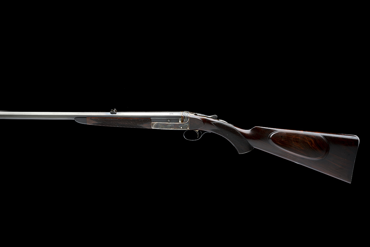 for 1908, 26 1/4in. black powder only octagonal barrel with matted sighting flats, standing notch rear sight with two folding leaf sights marked for 50, 100 and 150 yards and with white metal-inlaid sight lines, dove-tailed bead fore-sight, engraved 'JOHN DICKSON & SON. EDINBURGH.', and '250', and with a feathered border at the breech-end, non-selective ejector, the action with carved teardrop fences, removable striker disc, automatic safety with gold-inlaid 'SAFE' detail, border and bold acanthus scroll engraving, retaining much original colour-hardening and finish, 14 3/4in. figured pistolgrip stock with engraved and colour-hardened steel pistolgrip-cap, cheekpiece, including blued steel buttplate, Hackett-type snap-on splinter fore-end with horn finial, weight 5lb. 11oz.