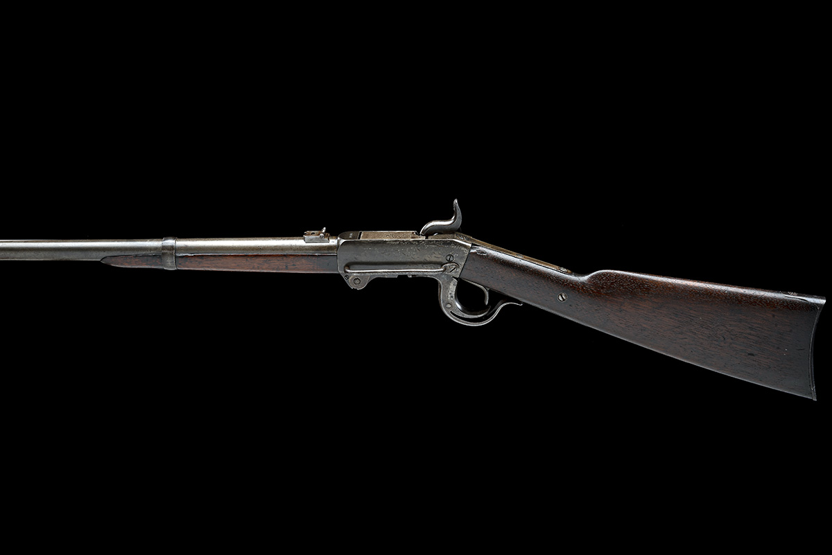 with 21in. barrel fitted with pinched blade front-sight, and leaf battle rear-sights to 500 yards, the breech top stamped 'BURNSIDE PATENT / MODEL OF 1864', (faint), interestingly although marked "Model of 1864" deliveries started in 1863 and this is one of the early deliveries from that year, breech block and action stamped with the serial number 6954, and for the convenience of the trooper a side-rib is fitted to the left-side of the action, back-action lock stamped in small letters 'BURNSIDE RIFLE CO. / PROVIDENCE R.I.', (faint), two piece iron mounted walnut stock, the splinter fore-end with one spring retained band, the butt with crescent butt-plate