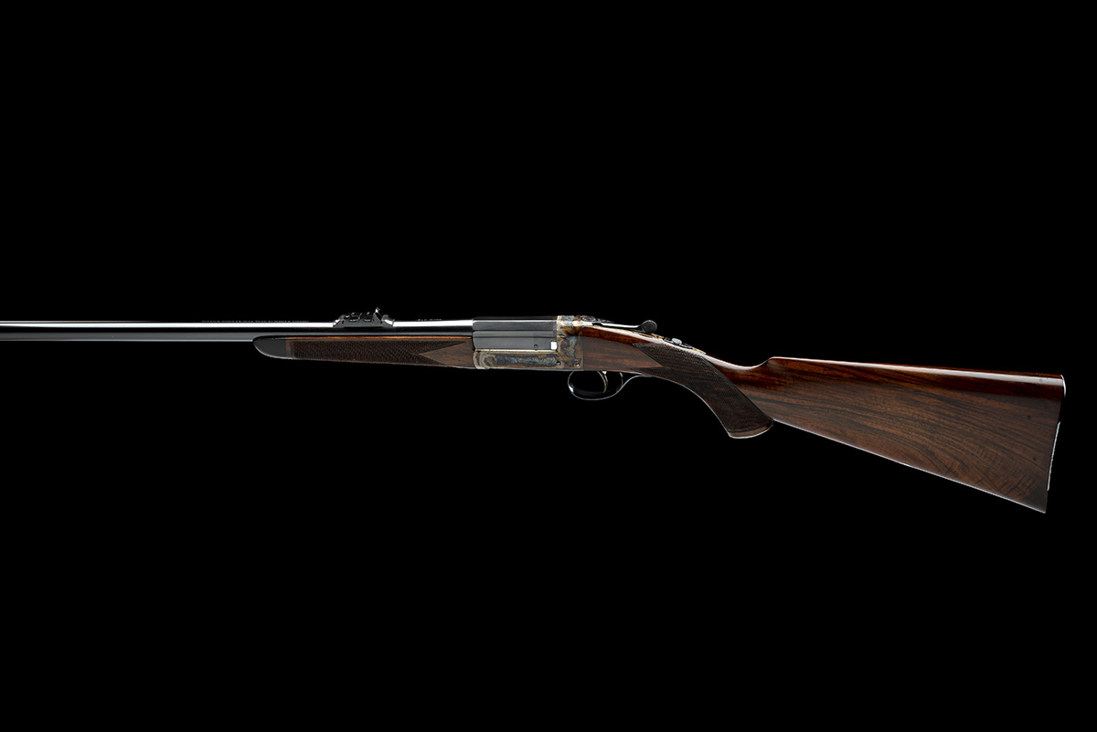 circa 1928, 26in. cordite proofed barrel with faceted breech-end, engraved 'WILLIAM EVANS. 63. PALL MALL. ST JAMES'S. LONDON. 300 BORE.', ramp and dove-tailed bead fore-sight, standing notch rear sight with two folding leaf sights, marked for 50, 100 and 150 yards and with white-metal inlaid sight lines, automatic safety with gold-inlaid 'SAFE' detail, removable striker disc, border and partial acanthus scroll engraving, retaining virtually full renewed colour-hardening and finish, 14 1/4in. figured pistolgrip stock with engraved and colour-hardened steel pistolgrip-cap, Hackett type snap-on splinter fore-end with horn finial, weight 5lb. 8oz.