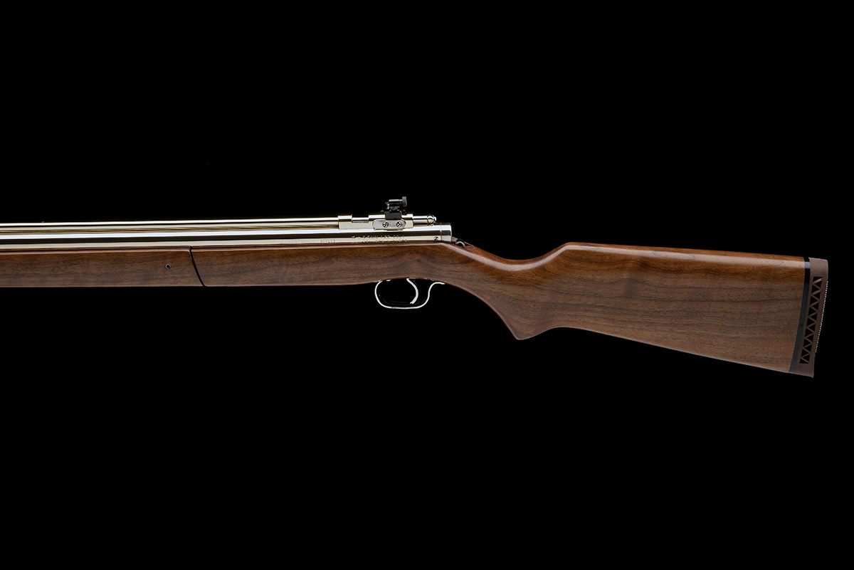 manufactured by the Benjamin Air Rifle Company for the proclaimed 100th anniversary of the firm in 1987, with gilt-washed brass 19in. barrel, blade fore-sight, gilt-washed brass bolt-action receiver fitted with a 'Williams' peep-sight, gilt washed brass pump-housing, figured plain American walnut butt-stock and fore-end, gilt washed furniture, appearing unused in its special padded sleeve with papers